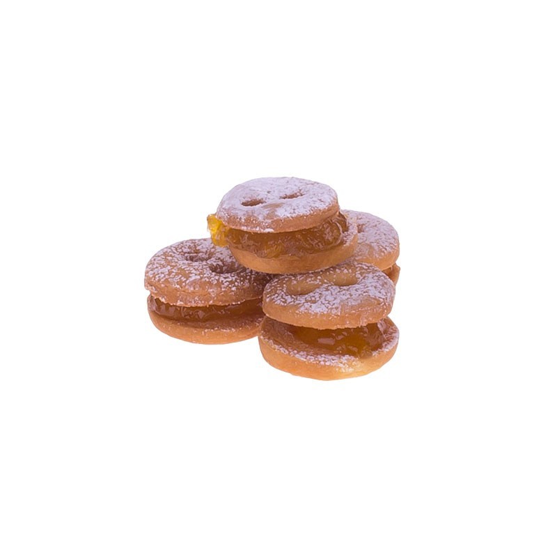 Kruche ciasteczka z masłem w okrągłej formie, przełożone konfiturą brzoskwiniową, posypane cukrem pudrem.