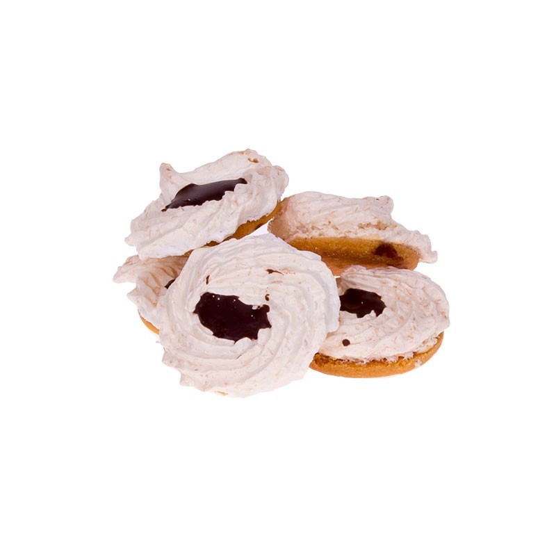 Kruche ciasteczka z bezą i kokosem oblane deserową czekoladową, w okrągłej formie.
