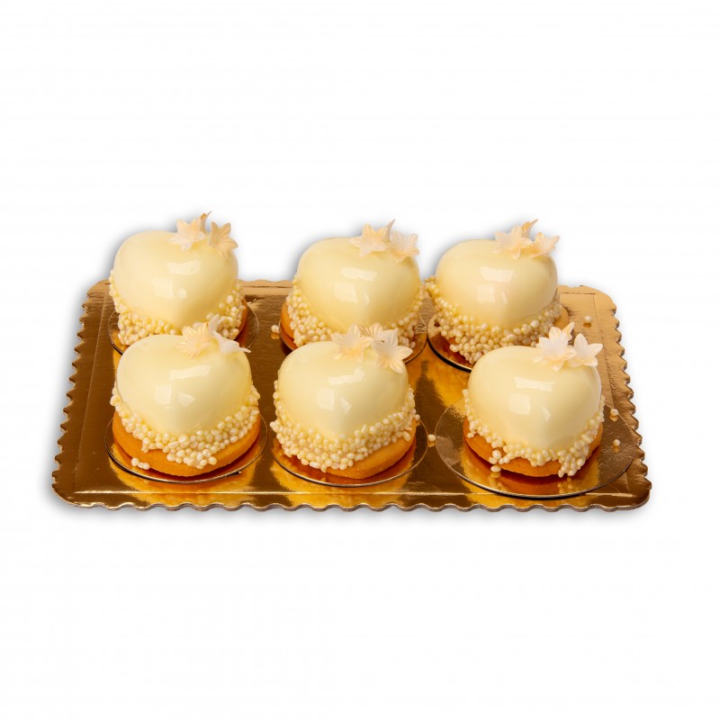 Monoporcja w kształcie serca o smaku białej czekolady z nadzieniem jagodowym.