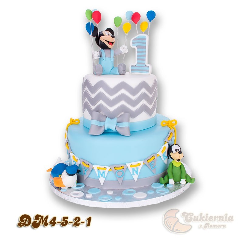 Okrągły tort w masie cukrowej z figurkami bohaterów "Klub Przyjaciół Myszki Mickey".