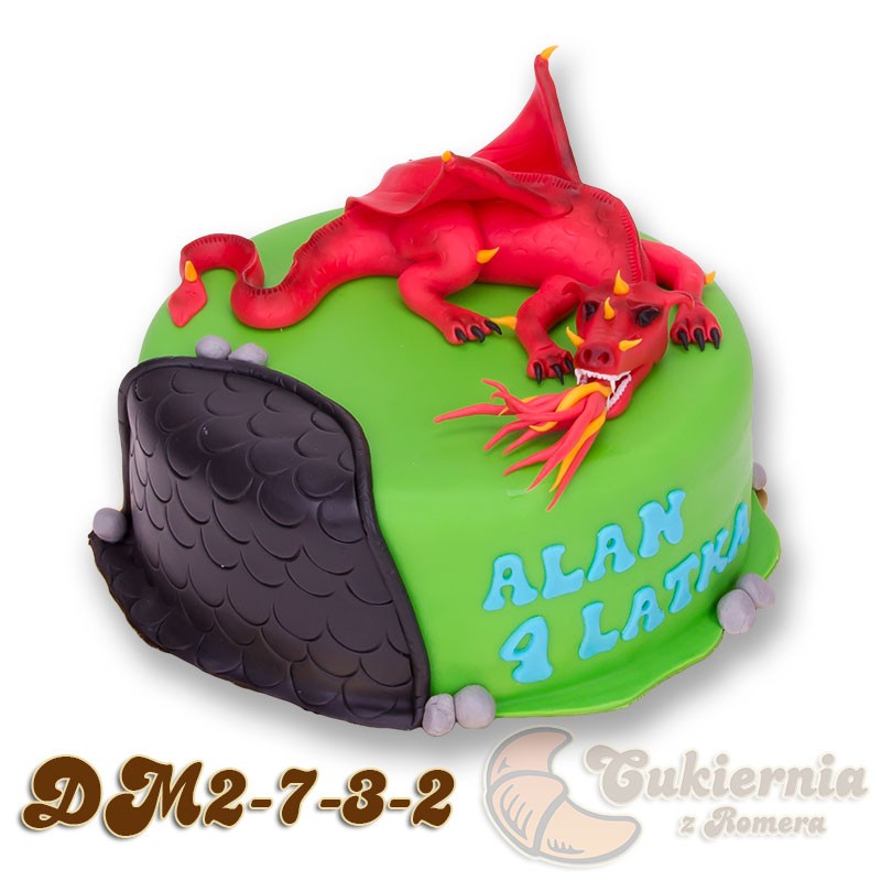 Okrągły tort w masie cukrowej z figurką smoka.